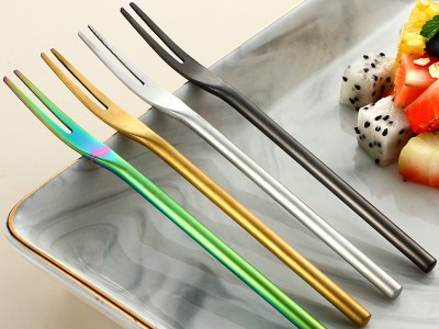 創(chuàng)意日式304不銹鋼砂光實(shí)心水果叉長柄圓柄月餅甜品蛋糕2齒水果簽