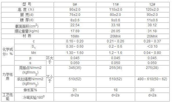 礦工鋼又稱(chēng)礦用工字鋼,屬型鋼系列,是煤礦支護(hù)專(zhuān)用鋼材,其形狀為工字型,與普通工字鋼類(lèi)似,主要用于煤礦礦井的支撐及金屬結(jié)構(gòu)支架使用。此種產(chǎn)品在礦井中常做成∏形,但腿常常斜向放置。相應(yīng)參數(shù)如下: