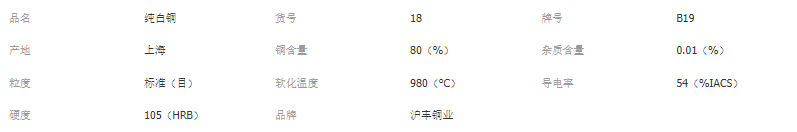 B19白銅為結(jié)構(gòu)銅鎳合金,有高的耐蝕性和良好的力學(xué)性能,在熱態(tài)及冷態(tài)下壓力加工性良好,在高溫和低溫下仍能保持高的強(qiáng)度和塑性,可切削性不好。B19結(jié)構(gòu)白銅,力學(xué)性能很好,耐蝕性很好,B19白銅用于制造在腐蝕性環(huán)境中工作的精密儀表零件,金屬網(wǎng),化工機(jī)械零件以及醫(yī)療器具。