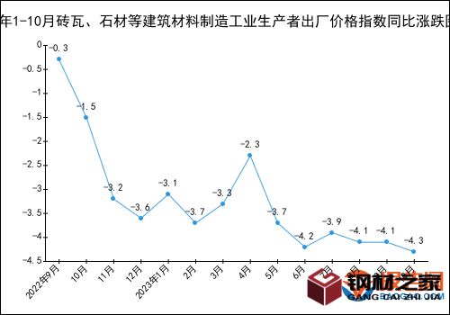 2023年10月磚瓦、石材等建筑材料制造工業生產者出廠價格指數為95.7,同比下降4.3%。