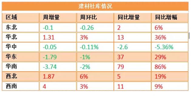 本周七大市場建材累庫分化,華北地區周庫存增加3%,較去年同期仍高出36%,華東和華南市場小幅去化,但庫存總量仍高于去年同期,尤其是華南市場同比增幅超過8成。目前僅華中地區庫存保持相對低位。雨水北抬對北方市場帶來一定影響。