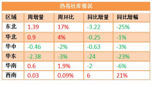 熱卷社會庫存壓力并不大,但本周華北、華南、西南市場出現小幅累庫,與產量上升有一定關系。整體來看,西南地區庫存壓力略高于其他區域,較去年同期庫存水平高出21%。多數城市庫存接近或低于去年水平,板強長弱仍會延續。