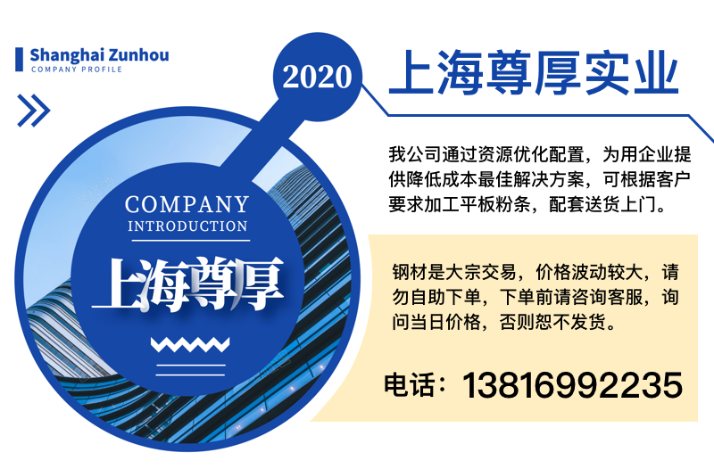上海尊厚實業有限公司是一家專門從事大宗鋼鐵現貨批發、物流配送、加工定制、國內貿易及出口的大型鋼貿企業、公司主要經營工字鋼、等邊角鋼、不等邊角鋼、槽鋼、H型鋼、扁鋼、方管/方矩管、焊管、鍍鋅管、無縫管、中厚板、冷軋卷、熱軋卷、螺紋鋼、船用鋼、圓鋼、低合金材料、不銹鋼材料、及鍍鋅產品。公司在上海寶山、閔行、浦東、松江等地擁有大型自備倉庫,在天津擁有控股鋼材市場及全資鋼管生產廠,常年備有現貨庫存2多萬噸,貨源充足。同時,公司擁有大型吊車,氣割、鋼板剪切加工等設備,可以提供“一條龍服務”優質服務,能夠根據客戶需求定制特殊規格材質的鋼材產品(包括國標、非標、美標、英標、日標等),且交貨期擁有保障