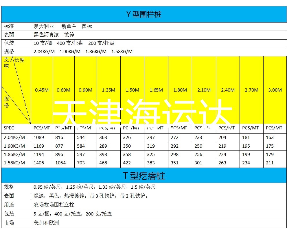 T型疙瘩籬笆樁:主要銷往美加和歐洲。規格:0.95磅磅/英尺,1.15磅/英尺, 1.25磅/英尺,1.33磅/英尺,1.50磅/英尺。長度:5英尺,6英尺,7英尺,8英尺。2孔尾翼和3孔尾翼。適用于養牛場圍欄,表面為沾漆,熱鍍鋅。